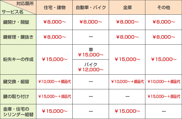 ・鍵や錠前や扉などの種類や形状、作業状況により作業料金が異なる場合もございます。